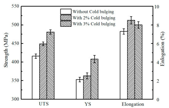 - Upon increasing the extent of cold bulging, the driving force responsible for the precipitation of the strengthening phase during the aging process was enhanced. As a result, the number, density, and uniformity of the precipitated phases increased, thereby improving the mechanical properties.