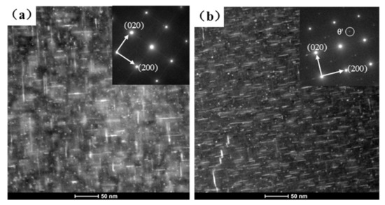 {001}Al TEM images of the as-aged samples with cold bulging at different ratios: (a) Without cold bulging and (b) with 2% cold bulging.