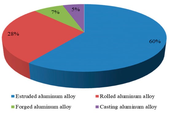 Traditional aluminum alloys for aircraft structures are principally high-strength Al 2XXX alloys (2024, 2224, 2324, 2424, 2524, etc.) and ultra-high-strength Al 7XXX alloys (7075, 7475, 7050, 7150, 7055, 7085, etc.) [10]. After the 1980s, new materials including aluminum–lithium alloys, rapid solidification aluminum alloys, and aluminum matrix composite materials have been rapidly developed [11,12]. The traditional 2XXX series and Al 7XXX alloy materials were greatly affected, but they still show strong vitality with their superior performance [13,14,15,16]. According to statistics, high-performance 2XXX series and Al 7XXX alloys are still mostly used in more than 70% structural materials of aircraft. According to the application classification, aviation aluminum can be divided into casting aluminum alloy, extruded aluminum alloy, rolled aluminum alloy, forged aluminum alloy, etc. [17] The aluminum proportional distribution for aviation is shown in Figure 3.