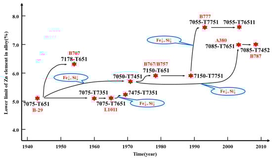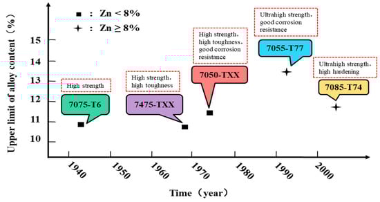 As shown in Figure 5, the development of Al 7XXX alloys could be roughly divided into five stages [2,13,26].