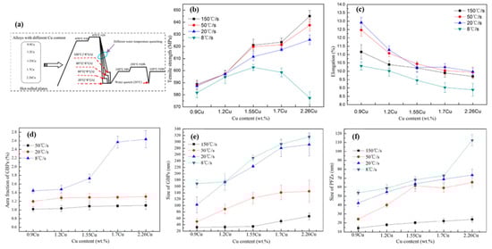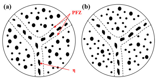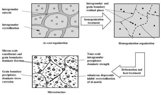 The purpose of heat treatment for Al 7XXX alloys is to optimize the three microstructure parameters of matrix precipitates (MPt), grain boundary precipitates (GBPs), and precipitate-free zone (PFZ), so that the alloys have good comprehensive properties. The heat treatment process of Al 7XXX alloys mainly includes homogenization, solid solution, quenching, and aging. The microstructure evolution of Al 7XXX alloys is shown in Figure 8 at different heat treatment stages. It can be seen that from the as-cast state to the uniform annealed state, the spherical intra-granular non-equilibrium eutectic phase and a network of the coarse non-equilibrium eutectic phase at the grain boundaries were basically re-dissolved into the aluminum matrix to form a supersaturated solid solution, with only a small amount of the impurity phases remained. From the uniform annealed state to the final state, a large number of tiny and diffuse needle-like and spherical particles are precipitated within the grains, and the grain boundary precipitates are distributed in chains along the grain boundaries [20,21,97,98]. We mainly discuss the effects of solid solution, quenching, and aging on the microstructure and properties of Al 7XXX alloys.