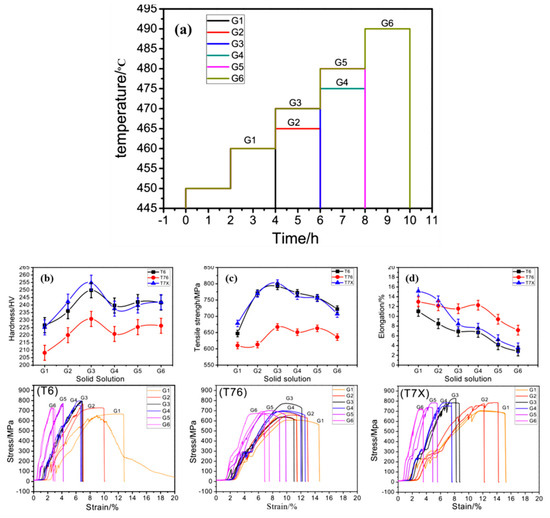 During the solid solution process, the grain size, undissolved second phase fraction and solute atom distribution of the alloy will be changed, which affects the mechanical properties. Xu et al. [103] performed multi-stage solid solution on aluminum alloy extrusion materials and characterized and tested their microstructure and mechanical properties. The specific solid solution process is shown in Figure 10a. The results are shown in Figure 10b–d. With the solid solution temperature and time increased, its strength increases to the maximum at G3 and then decreases. In the solid solution process on the conditions of 450 °C × 2 h + 460 °C × 2 h + 470 °C × 2 h, and the aging process on 121 °C × 5 h + 133 °C × 16 h, aluminum alloy has excellent comprehensive properties with strength of 828.0 M Pa and elongation of 8.1%.