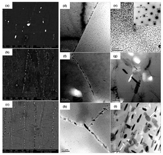 SEM images showing grain and sub-grain boundary precipitates in 7050-T6 alloys treated with different transfer times (a) 2 s, (b) 45 s, (c) 120 s; TEM images of 7050-T6 alloys treated with different transfer time (d,e) 2 s, (f,g) 45 s, (h,i) 120 s. (Reprinted with permission from ref. [110]. Copyright 2014 Elsevier).