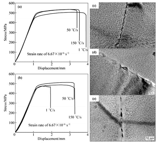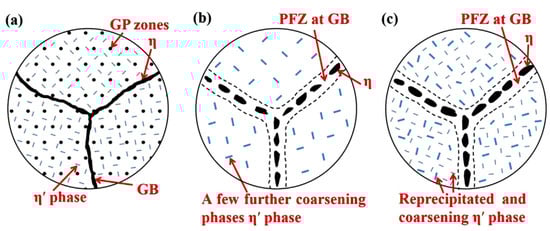 The solid solution regime for Al 7XXX alloys has developed from single-stage to multi-stage solid solution. Single-stage solid solution, as shown in Figure 9a, refers to enhancing the solid solution effect of the alloy element by simply increasing the final solid solution temperature and extending the solid solution time on the condition of avoiding over-burning. The disadvantage of this method is that the solid solution degree of alloying elements and the recrystallization fraction of the alloy increase simultaneously with the increase of solution temperature and time, and the comprehensive properties after ageing are poor [100]. Some scholars have proposed a stepwise temperature-increasing solution treatment to increase the solid solution degree of alloying elements while effectively suppressing the increase of the recrystallization fraction of the alloy. The stepwise temperature-increasing solid solution is shown in Figure 9b, which means that the alloy is first hold at a lower temperature for a certain time, and then gradually heated up to a higher temperature and held on. Through low-temperature solid solution, the low-melting non-equilibrium eutectic phase can be preferentially dissolved, and then gradually increased to exceed the multi-phase eutectic temperature, which promotes the maximum dissolution of the soluble second phase in the alloy. Simultaneously, the recovery takes place in the alloy during the low-temperature holding process, which suppresses the recrystallization in the subsequent high-temperature solid solution, so that the comprehensive properties of the alloy are significantly improved. In order to improve the stress corrosion resistance of Al 7XXX alloys, the near-solvus pre-precipitation following after high temperature solution treatment has been proposed, which means that solid solution occurs fully at high temperature and then holds near the limit temperature of solid solution [101]. As shown in Figure 9c, when cooling from a high temperature to a lower temperature and holding, the super-saturation of the alloy is reduced with the temperature decreasing. When cooling at a slower rate from a high temperature to a lower temperature for holding, due to the low speed of cooling, the temperature gradient changes a little, so that the precipitation power is small, and the precipitates preferentially nucleates at the grain boundaries. In the subsequent aging process, the aging precipitates can grow up on the basis of the original precipitates. Thereby, the grain boundary precipitates becomes coarse and is discontinuous distribution, and the resistance to stress corrosion is improved. On the other hand, the intra-granular precipitates is tiny and dispersed, and the alloy has high strength [102].