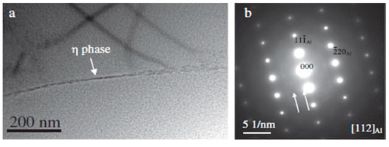 - Li, M.-H.; Yang, Y.-Q.; Feng, Z.-Q.; Huang, B.; Luo, X.; Lou, J.-H.; Ru, J.-G. Precipitation sequence of η phase along low-angle grain boundaries in Al-Zn-Mg-Cu alloy during artificial aging. Trans. Nonferrous Met. Soc. China 2014, 24, 2061–2066. [Google Scholar] [CrossRef]