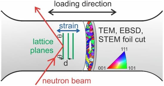 Schematic view of the investigated lattice planes by the neutron beam in relation to the direction of loading and introduced lattice strain of the tensile specimen. The thin electron transparent foils that were taken perpendicular to the loading direction were characterized microscopically using Transmission electron microscopy (TEM), Electron backscatter diffraction (EBSD), and scanning transmission electron microscope (STEM).