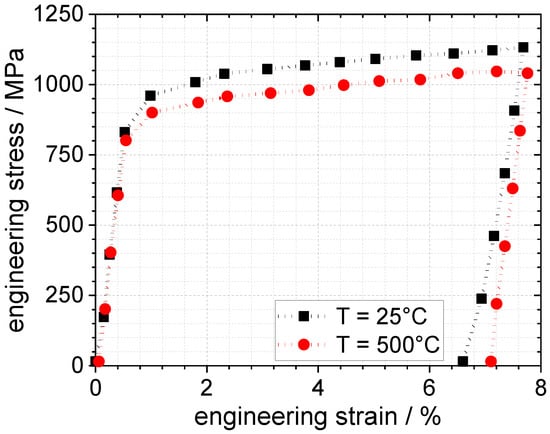 The macroscopic stress-strain curves of the VDM 780 specimens at 25 and 500 °C are displayed in Figure 3. The symbols indicate points at which the strain was held constant for about 45 min and the diffraction patterns were recorded. No significant change in load was measured during the holding segments. Therefore, creep deformation did not play a notable role during these experiments. The heat treatment, which was performed before the in situ tensile test, did not lead to a fully hardened condition. In the VDM® Alloy 780, a tensile strength of greater than 1400 MPa can be achieved. However, the material keeps its good mechanical strength up to 500 °C and continuously hardens until unloading the sample at both temperatures in the investigated condition. The stress response at 500 °C was only about 80 MPa below the stress response at 25 °C at the same engineering strain.