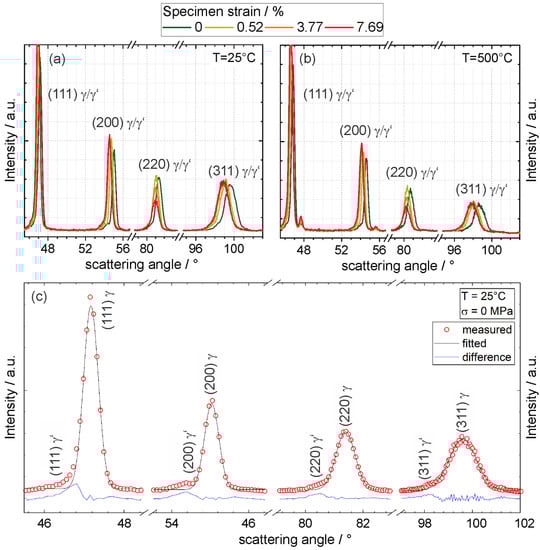 The diffraction patterns are shown in Figure 4 at selected specimen strains (at the beginning and the end of the elastic regime as well as the middle and at the end of the plastic regime) for the testing temperatures (a) 25 °C and (b) 500 °C. The shape and position of the Bragg peaks change with increasing applied load. The peak intensity and FWHM are the most important parameters that describe the peak. A change in the peak intensity can be correlated to a change in the preferred orientation of a phase. A change in the FWHM can be related to a change in the material defects like crystallite size or microstrains [33,34]. However, the crystallite size has to be rather small, usually clearly below 1 µm, to effectively influence the peak broadness [35,36]. Differences in the measured FWHM can therefore be related to a change in the microstrain that stems from a rising density of structural defects like dislocations or stacking faults in the grains, as the grain size is around 20 µm in this study. The results of the Gaussian curve fitting of the individual peaks are exemplarily shown for the sample tested at 25 °C in the unloaded state (σ = 0 MPa) in Figure 4c. The shape of the peaks was asymmetric. The broad peak shoulder on the left side can be attributed to the γ′-phase [26]. However, these additional peaks did not notably influence the peak height and broadness of the main peak, as the fraction of the γ′-phase was significantly lower than the one of the γ-phase, and the lattice misfit of 0.48 in between these two phases is rather high in this alloy [26]. Furthermore, the fitting procedure was focused on obtaining a good fit quality at the right bottom side as well as the peak width and height of the main peak. The Gaussian curve fits the position, intensity, and FWHM of the primary peak (γ-phase) quite well. The only major differences between the measured data and the fitting curves were found at the left side of the primary peaks, at which the peaks of the γ′-phase occur.