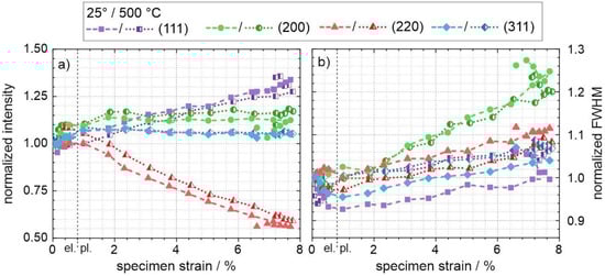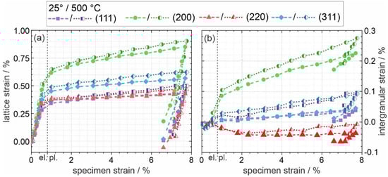 The influence of the applied specimen strain on the total lattice strain and on the intergranular strains is shown in Figure 6a,b, respectively. The strains were calculated according to Equations (2) and (3), respectively. The deformation in all lattice planes followed the same trend at 25 and 500 °C. The lattice strains were only slightly higher at 500 °C. The strain was rather anisotropic in the different lattice planes leading to significant intergranular strains (differences between lattice strains measured on different (hkl)-planes). The total strain in the (111) and (220) lattice planes was the lowest during the whole experiment. The (311) lattice planes showed higher lattice strains compared to (111) and (220). However, this difference was mainly due to the different Young’s moduli of the lattice planes (Table 2). The intergranular strain was almost equal in the (111) and (311) lattice planes (Figure 6b), and almost no intergranular strain remained in these lattice planes after the experiment. The largest intergranular strain was found in the (200) lattice planes during the whole experiment, which resulted in a considerably higher remaining strain in the (200) lattice planes. The grains in which the (200) lattice planes were perpendicular to the loading direction were the most favorably orientated ones for dislocation activities in the preferred {111} <110> slip systems. This facilitates plastic deformation at considerably lower stresses in these grains [37,42]. It is important to point out that a negative intergranular strain was measured in the (220) lattice planes, which means that the grains that are oriented in the [220] direction are compressed during the plastic deformation in the loading direction. The explanation of the opposite behavior in the (220) lattice planes has to be based on consolidation mechanisms between adjunct grains and the formation of textures during plastic deformation [43].
