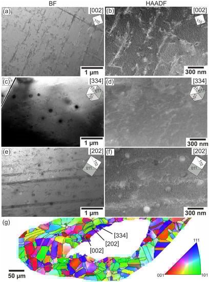 Additionally, STEM analysis was performed on a TEM foil. Figure 9a–f show BF and HAADF STEM images of grains in different orientations. The orientation was determined by EBSD (Figure 9g). Multiple active {111} <110> glide planes are found in the [002] orientated grain (Figure 9a,b). Apart from the distinct slip planes, single dislocation pairs homogenously distributed throughout the grain can be seen. In contrast, fewer dislocations and no strongly activated glide planes were visible in the grain oriented [334] (i.e., close to [111]) (Figure 9c,d). This correlates with the smaller Schmid factors of this oriented grain compared to the [002] oriented grain and indicates that less deformation takes place there. A table with all Schmid factors for the measured grains is depicted in Table 3. This confirms that the results presented in the previous chapter that the grains that are oriented in <111> were much less plastically deformed than the <200> oriented ones. The [202] orientated grain predominantly showed glide on only one slip system (Figure 9e,f), which can also be explained by the Schmid factors. Similar to the [002] orientation, dislocation activity was visible apart from the strongly activated glide planes, although less than in the [002] oriented grain.
