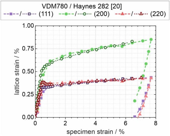 Comparison of the microscopic mechanical properties (lattice strain in different crystallographic orientations/specimen strain) of VDM® Alloy 780 (full symbols) with the literature data of the Ni-based superalloy Haynes® 282 (open symbols) [20]. The tensile test with Haynes 282 was stopped at a specimen strain of about 6.5%.