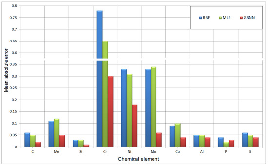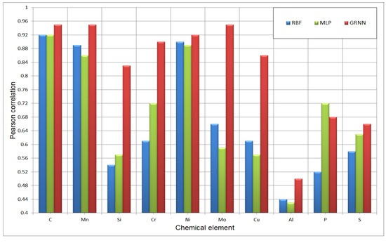 A similar situation occurred in the case of modeling the nickel concentration. Here also the correlation values between the networks are small and range from 0.89 to 0.92, but the errors are generally larger and amount to 0.18 (9.9%) for GRNN and from 0.31 (18.8%) to 0.33 (22.9%) for other networks. This is related to a higher concentration of this element in the tested steels. All three types of networks can be used for modeling; however, due to the smallest error value, GRNN is recommended.