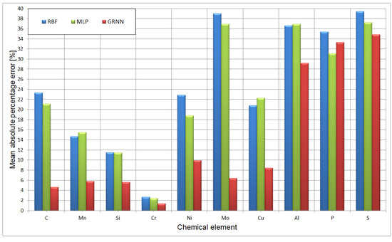 The best results were achieved for modeling the concentration of carbon, manganese, chromium, nickel and molybdenum. For these elements, the Pearson’s R correlation exceeded the level of 0.9 with a relatively low value of the mean absolute percentage error, which ranges from 1.4% for chromium to 9.9% for nickel. Equally good artificial neural networks, although with slightly lower Pearson’s R correlation values (which were below 0.9 and with mean average percentage errors below 9%) were obtained for silicon and copper.