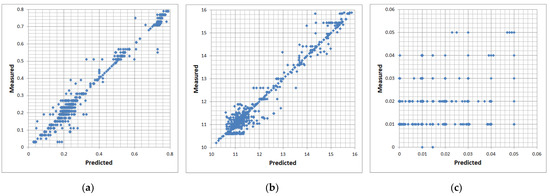 Neither type of network has successfully modeled phosphorus, sulfur and aluminum. The network parameters are too bad to be used for modeling. The highest correlation value is only 0.72, and the mean absolute error is too large. In the case of phosphorus, the concentration in the tested steels is 0.05, while the mean absolute error for the MLP network, the network that turned out to be the best, is 0.02. It seems that it is not much, but if we look at the mean absolute percentage error, it is as much as 31.1% of the value. Figure 4c shows how bad it is. For sulfur and aluminum, the network parameters are even worse. In the case of aluminum, the error value is almost 30% of the value, with a Pearson’s R correlation of only 0.5. A large number of rejected input variables, four in the case of the RBF network modeling the sulfur concentration, indicates no relationship between the input and output variables.