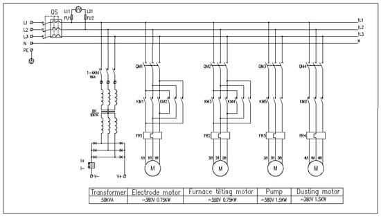 The PLC control must be programmed on a computer equipped with STEP 7-micro/WIN development tools []. The program mainly includes coded instructions to perform electrode lifting, water pump operation, and control the dust removal motor. Real-time data communication is established between the personal computer and the PLC through a TCP/IP protocol []. The electrical principle of the EAF, designed according to the national electrical industry design standards combined with laboratory conditions [,], is shown in Figure 4.