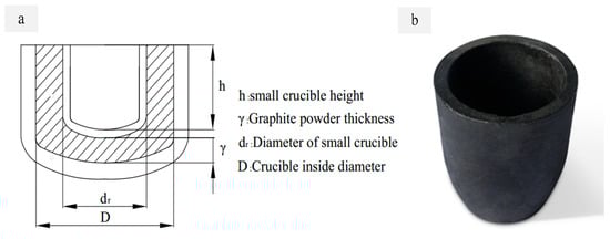 Figure 7 shows the improved molten pool structure and the physical shape of the small crucible. To ensure good electrical conductivity between two crucibles, a layer of graphite powder is included between them. The surrounding environment is filled with high temperature-resistant asbestos to prevent rapid heat loss. The molten product may be removed when the melting is complete and the crucible cools in the furnace.