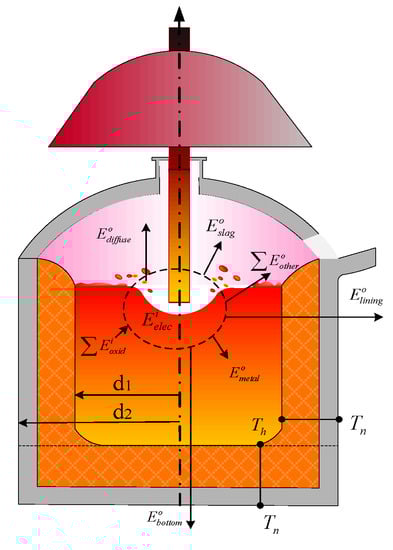 In the heating operation of the EAF, the actual power of the arc acting on the metal is only 60–65%; nearly 30% of the arc input power diffuses into the furnace, given by , whereas approximately 10% of the energy is used in slag heating and diffusing to the furnace bottom [,,,]. Theoretically, the conduction heat, Ebottom, can be calculated as shown in Equations (9) and (10) as: