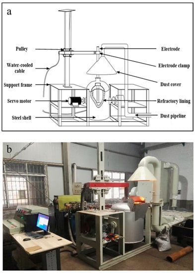 (a) Schematic diagram and (b) image of the electric arc furnace.