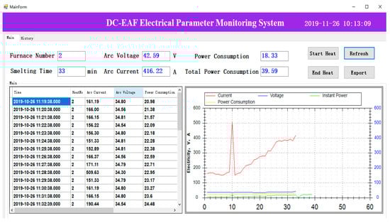 As an effective approach to solve the problem of excessive power consumption, we designed a real-time process monitoring system by analyzing the relationship between the current and the arc, based on the DC arc model. This system collects information pertaining to the electrical parameters (electrode voltage, electrode current, etc.) in real time via PLC, which guides the operation of power supply in the experiment and collects feedback in real time. The monitoring system is driven by the information flow to realize closed-loop control of the smelting process effectively.