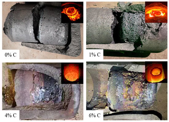 Titanium-containing metallized pellets were crushed to 10–15 mm by the counter-roller crusher. To find the optimal concentration of the reducing agent, four groups of experiments were conducted with coke concentrations (wt.%) of 0, 1, 4, and 6% coke, respectively. It was estimated that the experimental temperature of each group reached 1600 °C and the melting time was 90 min. Figure 12 illustrates the physical schematics of the reduced samples and crucibles in the four groups of experiments. The cross-section of the crucible reflects the clear boundary between metal and slag, which effectively prevents secondary pollution between the metal and slag.