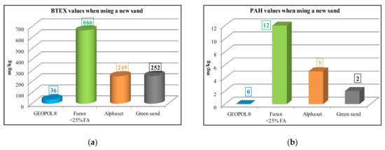 Comparison of ecological performance of organic and inorganic binder system during pouring: (a) BTEX values and (b) PAH values [13].