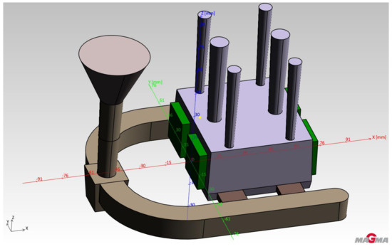 An ester cured self-setting sodium silicate process was used to make the molds. Due to its properties (especially with regard to heat dissipation), this system is very close to the effect of metal molds (accords to real operating conditions) [14]. These assumptions were verified before the actual casting tests using the simulation program MAGMASoft. The aim of the simulation was mainly to verify the functionality of the proposed casting technology and to predict the heating of the tested cores. Input parameters of the intended production technology were used to set the simulation (casting—aluminum alloy AlSi7Mg, mold—ester cured self-setting sodium silicate process, cores—RCS and casting temperature 720 °C). Figure 4 shows the geometry of the test casting including the inlet system, vents and cores. Figure 5 shows the prediction of temperature distribution in the cores immediately after pouring.