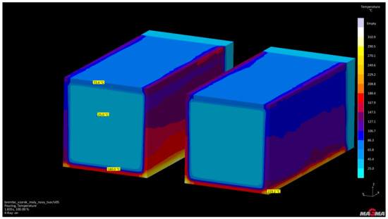 From the performed simulation it is evident that the achieved temperature of the test cores after casting is significantly lower (25–229.5 °C) than the temperature of thermal destruction of the Novolak resin used for RCS technology (approximately 600 °C).