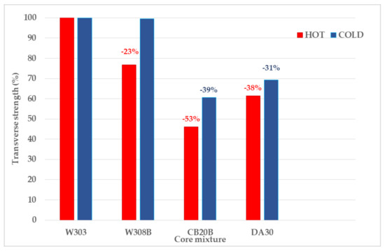 The achieved results show that the highest hot transverse strength was achieved with mixtures using the inorganic binder GEOPOL® W, 4.80 MPa for the W303 system and 3.68 MPa for the W308B system. The same trend was observed for cold transverse strength. Again, the highest transverse strengths were found for the W303 system (7.36 MPa), however, the same strengths were achieved for the W308B system (7.33 MPa).