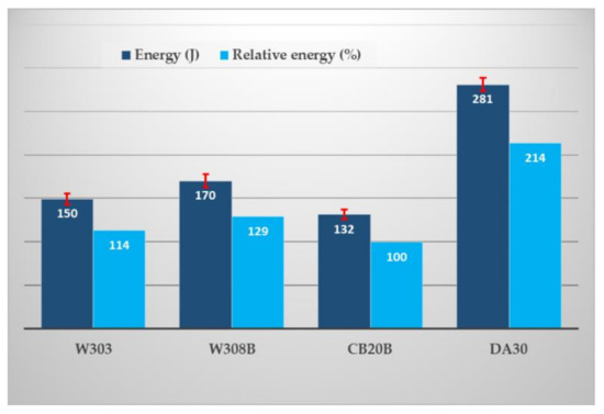 Other factors also play a role: (i) the type of powder additive for inorganic systems. With the same binder content (2%), the impact energy ranges from 150 (W303) to 170 J (W308B), an increase of 12%. (ii) The effect of the binder content as such is also apparent. The RCS mixture CB20B mixture achieved an impact energy of 132 J, with a binder content of 1.8% (see Table 2). On the other hand, the value of impact energy 281 J in the DA30 system is probably due to the highest binder content (2.8%) of all studied mixtures. Related to this is the possibility of influencing the collapsibility of mixtures with inorganic binders. With regard to the achieved mechanical properties, both hot and cold, there is a possibility to reduce the impact energy by lower binder dosage (reduction from 2.0% to 1.8%), which is in accordance with the general rules for controlling the mixture with inorganic binders.