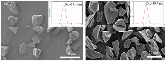 Figure 1 shows the size distribution and the scanning electron microscopy (SEM) of SiC and B4C powder applied in the SLS process. Figure 1a shows the powder granularity of the SiC powder, and the mean particle size of the SiC powder was 19.4 μm. While Figure 1b shows the morphology of B4C, its mean particle size is also 19.4 μm. Both powders are irregular polygonal forms and show no aggregation.