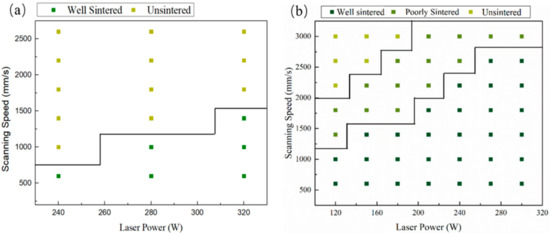 Figure 3 shows the processing window with no boron carbide addition and with 15 wt% B4C addition. It can be seen from the figure that the processing window with 15 wt% B4C addition is much broader. The processing window’s expansion is related to the interaction between boron carbide and silicon carbide during laser sintering.