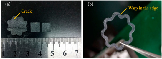 The splashing phenomenon will be alleviated with a higher scanning speed. Therefore, this indicated that with the increase of boron carbide addition, due to higher scanning speed being adopted, the surface roughness of the sample will also be improved. This phenomenon is consistent with the phenomenon observed in the experiment. The samples prepared by a higher scanning speed (P = 300 W, V = 1800 mm/s) are shown in Figure 5. As can be seen from the figure, the square samples formed by direct laser sintering showed good integrity in terms of shape. A slight warp can be observed in the edge of all the samples; a tiny crack can be observed in larger samples shown in Figure 5a. That indicated the internal stress accumulated with the increase of the sample size. Therefore, the zigzag strategy is not suitable for the preparation of larger samples. The line shrinkage of the samples was about 4.8% when B4C addition reached 15 wt%. The shrinkage of the samples was only 1.2% when pure SiC was adopted. In our previous study on reaction-bonded B4C/SiC, when the B4C addition reached over 15 wt%, the strength of the samples could dramatically be decreased, and abnormal grain growth could be observed in the microstructure when the sintered temperature was over 1650 °C. This abnormal grain growth was also called coarsening during the silicon infiltration process into the B4C body (reported by Cuiping Zhang et al. [29]). Laser irradiation can heat the scanning area to more than 2000 °C; In our study, the highest B4C content was selected as 15 wt%.