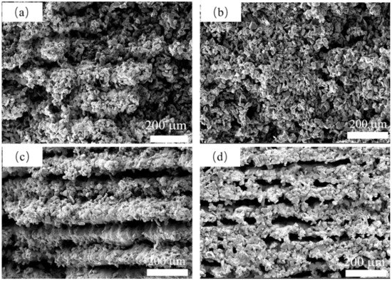 The microstructure with different B4C addition is shown in Figure 9. As shown in Figure 9a,b, a porous structure with no clear orientation was formed by the stacking of SiC particles. A continuous silicon carbide struts like stripes can be observed in Figure 9c when B4C addition reached 10 wt%. When boron carbide addition reached 15 wt%, as shown in Figure 9d, an oriented porous structure can be observed, and large pores were formed. As shown in Figure 9d, the SiC and B4C particles were all melted together. This phenomenon is attributed to the generation of liquid phase content caused by the addition of B4C content. Because the generation of the liquid phase is strictly related to the laser sintering process, the capillary force generated by the liquid phase drives the particle to regroup during laser sintering and forms an oriented structure. Due to the addition of B4C enhancing the densification process of SiC [32], the porous struts with 15 wt% B4C addition are denser than those with no B4C addition, which would be beneficial for its mechanical performance.