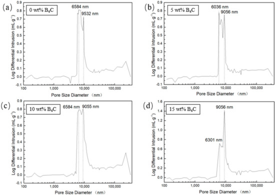 The pore size distribution of porous SiC is shown in Figure 10. As shown in the figure, with the increase of B4C addition, the number of bigger pores (about 9 μm) increased. The smaller pores (approximately 6 μm) decreased, indicating the increase of mean pore diameter. The mercury intrusion results showed that the mean pore diameter slightly increased from 9.5 μm to 11.3 μm. The results are consistent with the results of microstructure observation. With the addition of B4C increased, the amount of liquid phase in the laser sintering process also increases, promoting densification process, which enhanced the tiny pores merge to grow into large pores. The porosity of the porous SiC with no B4C addition was 53%, when the addition of B4C reached 15 wt% the porosity can reach 67%, and the density is about 1.61 g/cm3 and 2.03 g/cm3, respectively.