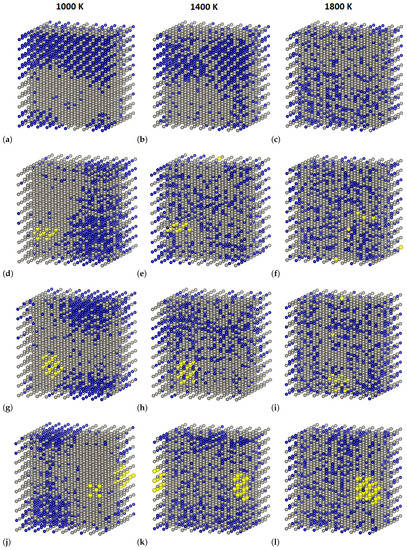 In Figure 7, image structures for the derivative WCr, WCrY, WCrY, WCrY, and WCrY alloys at three different temperatures (1000, 1400, and 1800 K) are given. A very strong tendency towards clustering has been observed for Y atoms at 1000 and 1400 K for all alloys containing Y (Figure 7a,b,d,e,g,h,j,k,m,n). It has been noted that at 1800 K for the WCrY alloy, which contains the least amount of Y, clustering of yttrium was no longer observed. Based on Figure 7, it has been concluded that 1 at.% is the minimum concentration of Y required to observe the clustering at 1800 K (Figure 7i). In Figure 7a–c, image structures for WCr alloy are given at 1000, 1400, and 1800 K, respectively. It has been observed that there is a strong segregation between Cr and W atoms even at 1400 K, while in alloys containing Y, there has been no segregation between Cr and W atoms observed. This is in agreement with ODTT presented in Table 2, where it has been shown that the presence of Y in Cr-W alloys decreases the ODTT.