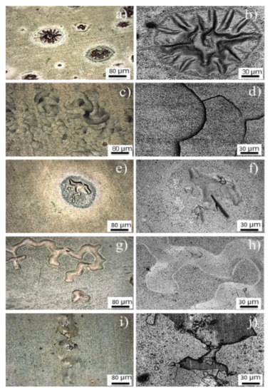 Optical (a,c,e,g,i) and confocal laser scanning microscope (CLSM) (b,d,f,h,j) micrographs of the heterogeneities found on the oxide layer for each maraging steel grade investigated here.