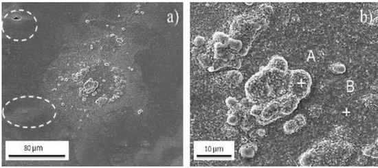 Scanning electron microscopy (SEM) micrographs of the oxide formed on Mar300 maraging steel, (a) different heterogeneities found on the surface of the oxide and (b) magnification of the defects found on the oxide.