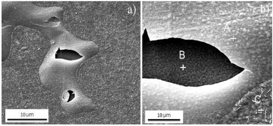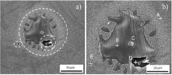 In Figure 6a, it is possible to observe different heterogeneities dispersed in the different oxide layers for both maraging steel grades, which are identified with white circles, including cracks, ridges, valleys showing the internal oxide, and areas with different straight edges presenting the limits of the chemical composition. On the other hand, Figure 6b shows a high-magnification SEM micrograph of the main defects. Furthermore, in this image, punctual EDS analysis was also carried out on each defect and the results are summarized in Table 4. As is depicted in this table, there was a difference between points A (located at the homogeneous surface oxide layer) and B (surface valley). The main difference between each point may be associated with the generation of different phases along the oxide layer. On the other hand, point C, located in a nodule at the top of the ridges, presented a composition close to point A, which suggests that the latter is formed above the ridges. At point D, which corresponds to the internal part of the oxide layer, a higher concentration of the main steel elements can be seen. This information confirms a difference in concentration for the different oxide layers. These differences from a chemical and morphological point of view may indicate the existence of different phases or compounds dispersed along the oxide layer thickness. Finally, the EDS spectra conducted inside a rectangular pore shape (point E) with straight edges presented a chemical composition rich in titanium and nitrogen, which may be related to the formation of titanium nitride (TiN) generated during the solidification process in concordance with results previously reported by Capurro et al. [13] and Silva et al. [14].