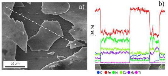 (a) Scanning electron microscopy (SEM) micrograph and (b) linear energy dispersive X-ray (EDS) spectrum made on the white dash line of the Figure 7a of the oxide surface formed on Mar300 maraging steel.