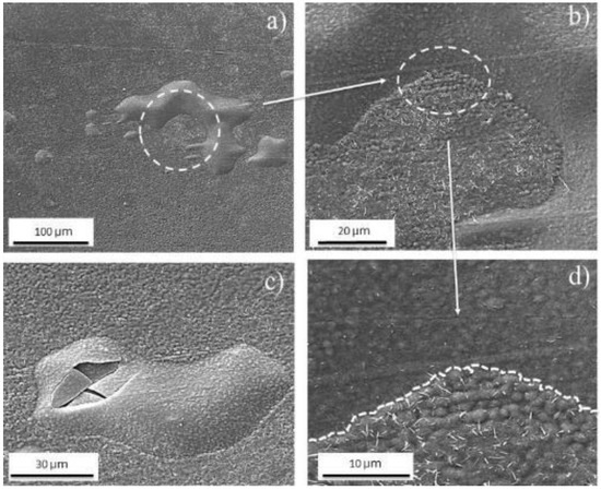 Other defects that were heterogeneously distributed along the oxide layer for both grades were the protuberances, as shown in Figure 9a,c. The images suggest that these protuberances were formed by different phases. A high magnification of these defects is shown in Figure 9b,d, and the interphase between this defect and the oxide layer is delimited by white dotted lines.