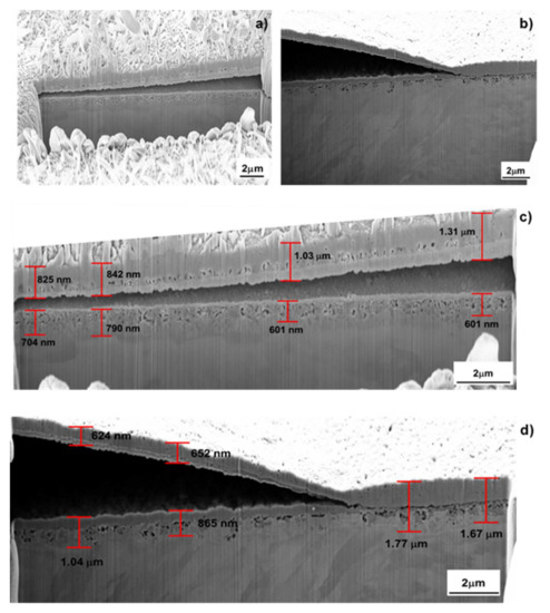 The Phenom XL Desktop SEM microscope (ThermoFisher Scientific, Lenexa, KS, USA) with EDS detector was used to observe the oxide and obtain the chemical composition measurements. Furthermore, the oxide layer thickening as well as the microstructure was determined by focused ion beam (FIB) milling of cross-sections and scanning electron microscopy (SEM) inspection. It was done by using a dual beam workstation, field emission scanning electron microscopy (FE-SEM) Zeiss Neon 40 (Carl Zeiss NTS GmbH, Oberkochen, Germany).