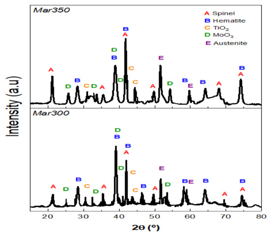 The semi-quantification of the phases presents in the oxides led to the determination of the phase formed in the oxide layer. The oxide layer created for the Mar300 maraging steel was mainly constituted by about 69.3% spinel, 23.8% hematite, 5.9% MoO3, and 1% TiO2. On the other hand, the other oxide layer was constituted by about 65% spinel, 23% hematite, 10% MoO3, and 2% TiO2. It is understandable that a higher amount of titanium oxide was found in Mar350 maraging steel due to the higher amount of this element in the chemical composition of this steel; however, the increase in the amount of molybdenum oxide cannot be associated with the amount of molybdenum in the chemical composition of this steel. The molybdenum content was almost identical in both steels, and this increase could thus be due to the greater amount of cobalt that was used to decrease the solubility of molybdenum in steel, which produces a greater amount of intermetallic precipitates rich in molybdenum and titanium during the aging heat treatment [18,19,20,21]; therefore, it is possible that on the surface of the maraging steel, this phenomenon provided a greater quantity of these elements that reacted and formed these oxides.