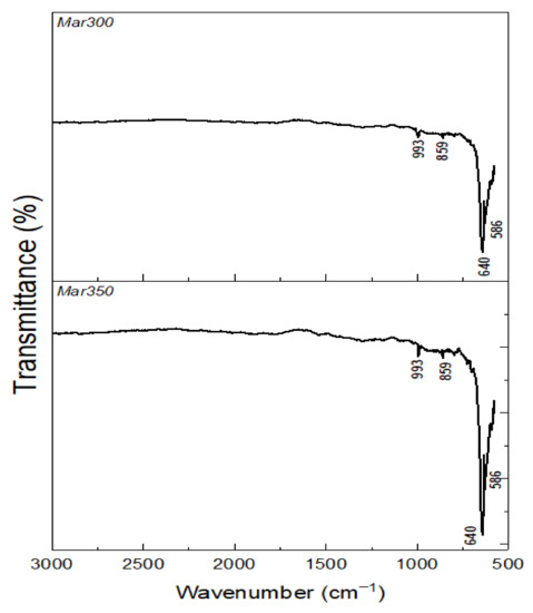 The Fourier transform infrared (FT-IR) spectra collected for the oxides of both steels are shown in Figure 12. The band located at 640 cm−1 corresponded to the of stretching vibration of Fe-O bonds in the structure of α-Fe2O3 (hematite), in agreement with Reference [22]. On the other hand, the band located at 586 cm−1 corresponded to the stretching vibration of the Fe-O links in tetrahedral locations of the cobalt spinel structure—CoFe2O4—as reported previously [23,24,25,26]. Likewise, there were characteristic bands of MoO3 at 993 cm−1 due to vibrations in the Mo=O bonds within the molecule, and at 859 cm−1 due to Mo-O-Mo bonds that connect the different molecules [27,28].