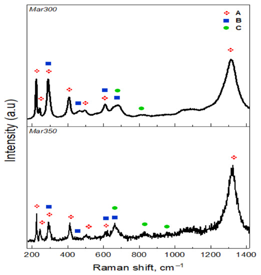 Figure 13 shows the Raman spectra for the oxide layer of each maraging steel grade investigated here. However, in both oxide layers, the same species were found. Hematite (α-Fe2O3) labeled as A [29,30], spinel cobalt ferrite CoFe2O4 bands (B) [24,31,32], and Molybdenum oxide (MoO3) were identified (C) [17,33,34]. As was clearly evident in the FT-IR and RAMAN spectra, it was not possible to detect the titanium oxides, and this is an indication that this element was in the innermost layers.