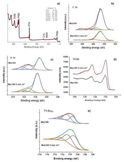 X-ray photoelectron spectroscopy (XPS) spectra of samples with the oxide produced on maraging steel 300 (Mar300) before and after etching for 5 min with Ar+ plasma (Mar300 5 min Ar+). (a) Survey spectrum of sample Mar300: (b) C 1s, (c) O 1s, (d) Fe 2p, and (e) Fe 2p3/2 deconvoluted.