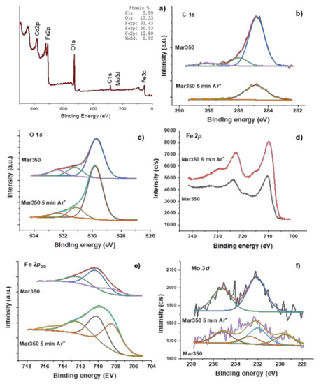 X-ray photoelectron spectroscopy (XPS) spectra of samples with the oxide produced on grade 350 maraging steel before (Mar350) and after etching for 5 min with Ar+ plasma (Mar350 5 min Ar+). (a) Survey spectrum of sample, (b) C 1s, (c) O 1s, (d) Fe 2p, (e) Fe 2p3/2 deconvoluted, and (f) Mo 3d.