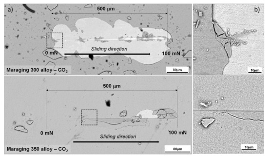 Scratch tests led us to determine the adhesive damage between the oxide layer and the metallic maraging alloy substrate, also denoted as Pc2. Figure 16 (left hand side) exhibits the whole scratch track. The behavior was clearly discerned by comparing the micro-fracture events and damage features in regions close to the track edges. Figure 16 (right hand side) shows top-view field emission scanning electron microscopy (FE-SEM) images of nanoscratch tracks, where some interesting features are clearly visible—mainly, chipping, also known as decohesion. Furthermore, the Pc2 directly determined from the FE-SEM micrographs are summarized in Table 8. From Figure 16 and the data summarized in Table 8, it is clearly visible that the oxide layers grown on the maraging 350 alloy required a higher force in order to detach the oxide layer growth under the CO2 atmosphere from the metallic maraging substrate.