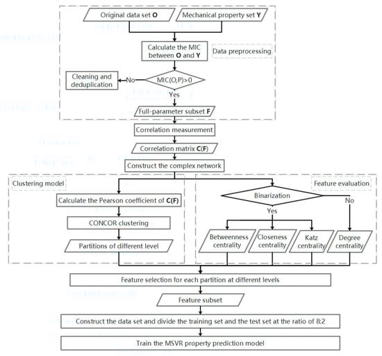 Based on the relevant basic theories in Section 2 and the requirements in Section 3.1, we propose an algorithm that firstly uses MIC to measure the linear and nonlinear correlation relationships between high-dimensional parameters. Secondly, we construct a complex network, and quantitatively evaluate each feature by CONCOR clustering method and centrality and influence analysis. Eventually, we could obtain the feature subset that could represent the full parameters efficiently, which could be used as the input of MSVR and to predict the mechanical properties. In order to verify the effectiveness and feasibility of the algorithm, the full-parameter set, empirical subset, and the best feature subsets selected based on MIC and Pearson coefficients are used as input for MSVR respectively, and the method with the least error and the optimal feature subset could be obtained.