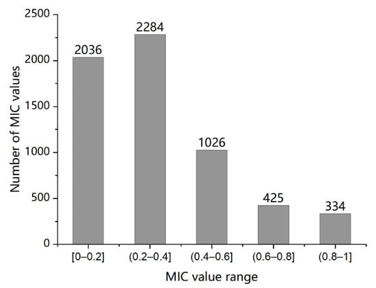 The distribution of MIC values among the 111 process parameters is shown in Figure 3. It can be seen that nearly 50% of MIC values are greater than 0.43 and 34 values are more than 0.8, which indicates that there are indispensable correlation relationships between these features. It is necessary to mine these relationships and remove redundant features, so as to clarify the nature of the relationships between features and simplify the input data set of subsequent modeling.