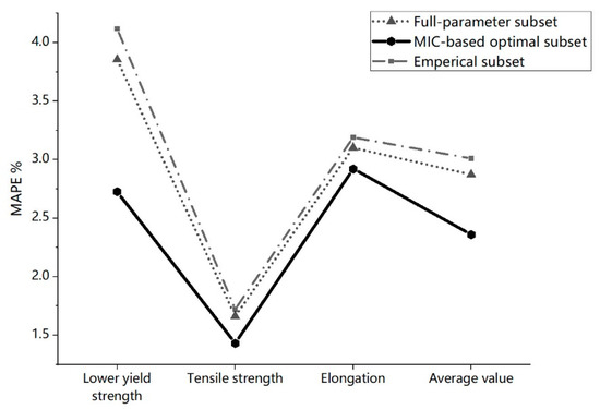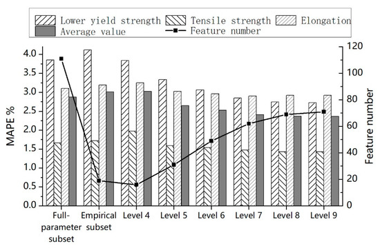 Figure 9 shows the MAPE comparison between feature selection results based on MIC-based subset, full-parameter subset, and the empirical subset. It can be seen that starting from level 5, four kinds of prediction error (including three MAPE values of three mechanical properties and their average) of our proposed algorithm are all lower than the other two input sets. In addition, as the number of selected features increases from level 4 to level 9, the growth rate slows down and the prediction error decreases. At level 9, the number of features reaches the maximum 71, while the four MAPE values all reach the lowest.